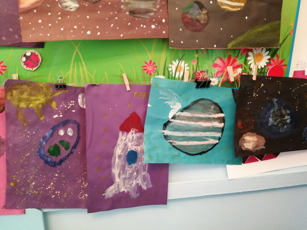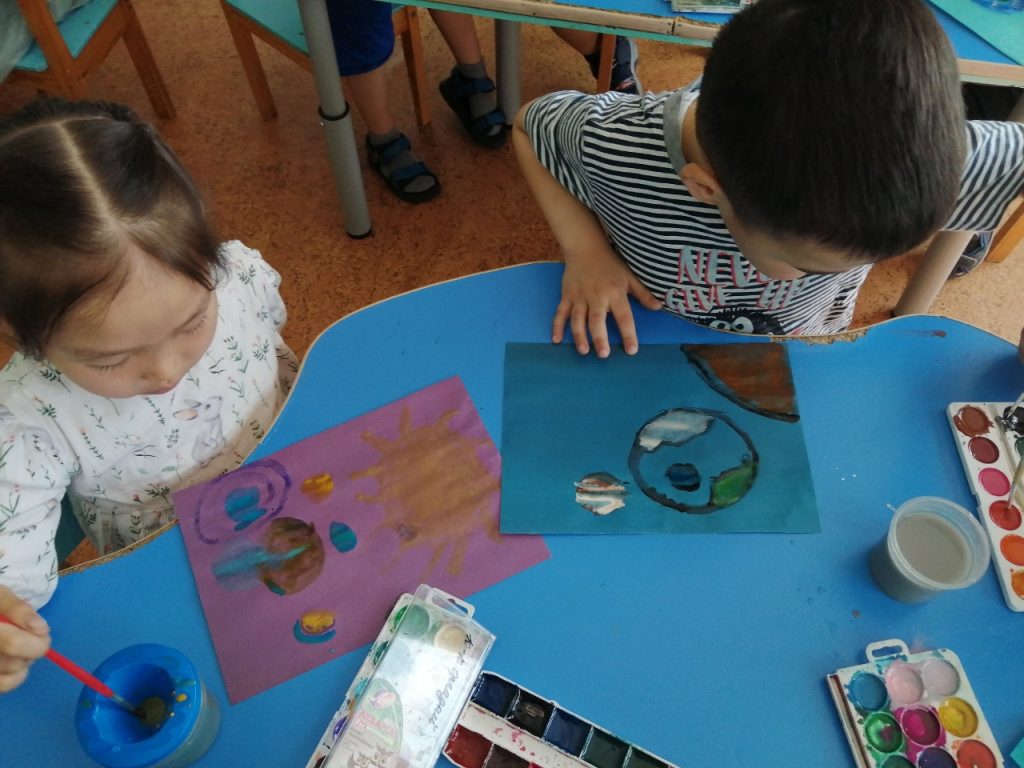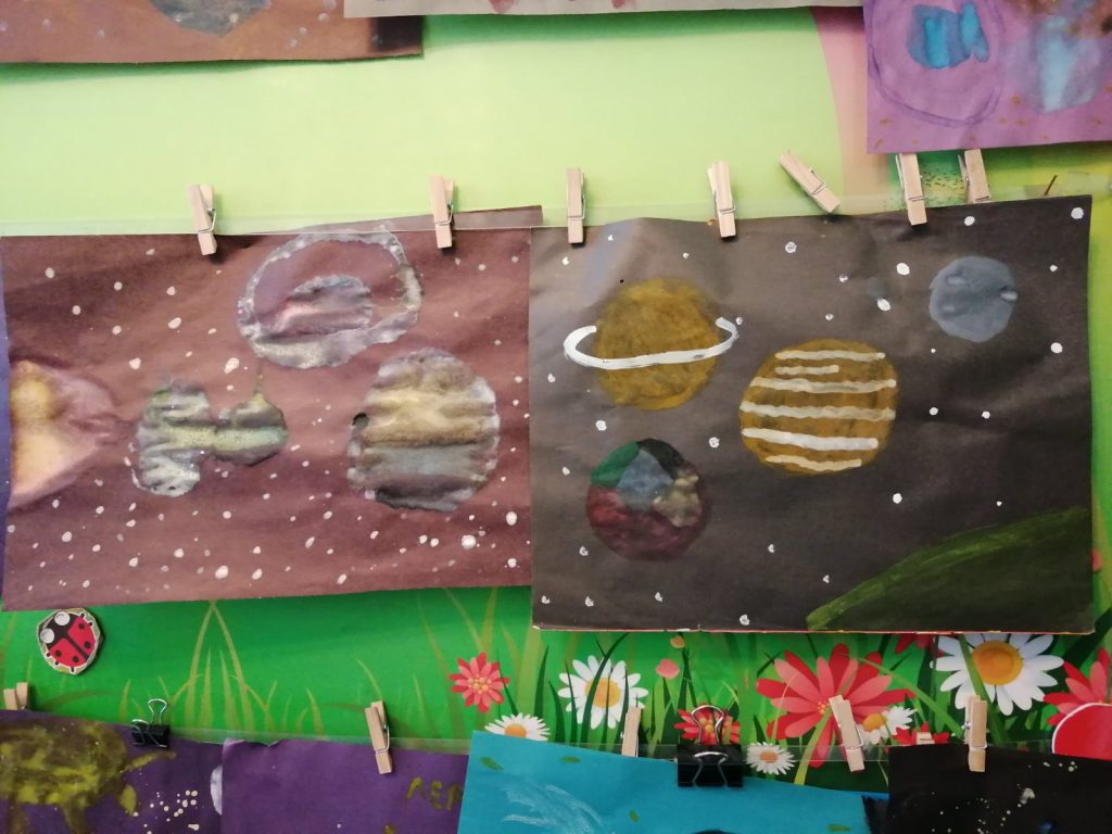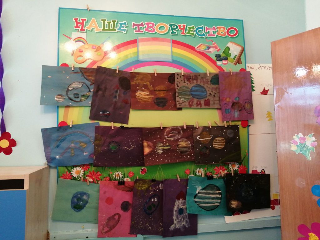 Согласно комплексно — тематическому планированию в детском саду с 8 по 12 апреля проходит неделя изучения темы «Космос». Дети познакомились с историей возникновения праздника, слушали рассказы о Юрии Гагарине и других героях, которые покорили космос, таких как Леонов, Терешкова, Титов и других. Дети с большим интересом слушали рассказы Бороздина «Первый в космосе» о первом человеке, отправившемся покорять космическое пространство и рассказы «Запускать змея», «Война», «В небе». Рассматривали энциклопедии о космосе, делились впечатлениями. Во время занятия ребята не только получали новую информацию, но и с большим удовольствием собирали ракету из геометрических фигур, смотрели мультфильм о планетах и их особенностях, разгадывали загадки о космических объектах, организовали строительную игру «Космодром». Оформили тематическую выставку космических рисунков. У детей осталось море позитивных эмоций, появилось желание быть похожими на сильных духом и мужественных космонавтов.