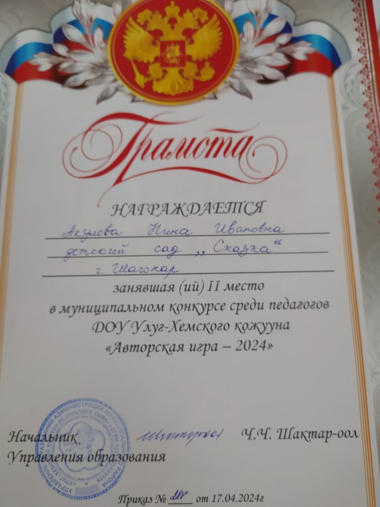 С целью создания условий для всестороннего развития познавательной и творческой инициативы детей дошкольного возраста, обогащения развивающей предметно – пространственной среды авторскими дидактическими играми, предназначенными для решения педагогических задач в соответствии с ФГОС и ФОП ДО 17 апреля прошел кожуунный конкурс авторских дидактических игр. Приняло участие 17 педагогов детских садов кожууна. Наша участница Акулова Нина Ивановна заняла почётное 2 место со своей интерактивной игрой «Люби и знай родной свой край»