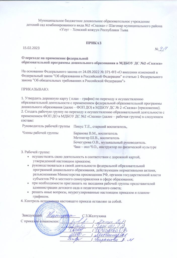 Педагогический коллектив МБДОУ № 2 « Сказка»  на педагогическом совете ознакомился с Федеральной образовательной программой дошкольного образования, Дорожной картой ФОП ДО и необходимостью приведения в соответствие с ФОП ДО своей основной образовательной программы, рабочих программ не позднее до 1 сентября 2023 года (п. 4 ст. 3 Федерального закона от 24.09.2022 № 371-ФЗ) .